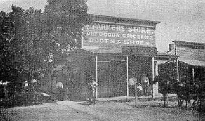 This building was moved to Farnam from Keystone and was the first general store in Farnam. Castile & Anderson conducted the business here until May, 1887, when Patrick Wrin, bought the business and continued in the business for several years. The picture was taken undoubtedly shortly before after 1900. The people standing in front of the team of horses are Mr. and Mrs. J. O. Martin and children. Mr. Martin run the store at that time. The man standing in the foreground was John Ballard, who was marshall at that time.