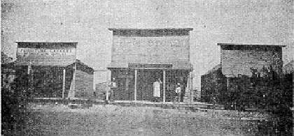 These three buildings stood where the Postoffice, Hines and the bakery are now. The center building was the first drug store built in Farnam and was built in 1886. This building later was used by Buss & Divoll as a general merchandise store and the drug store moved across the street on the same lots where the McElmoil drug store now is. Just when the other two buildings were built is not known for certain.